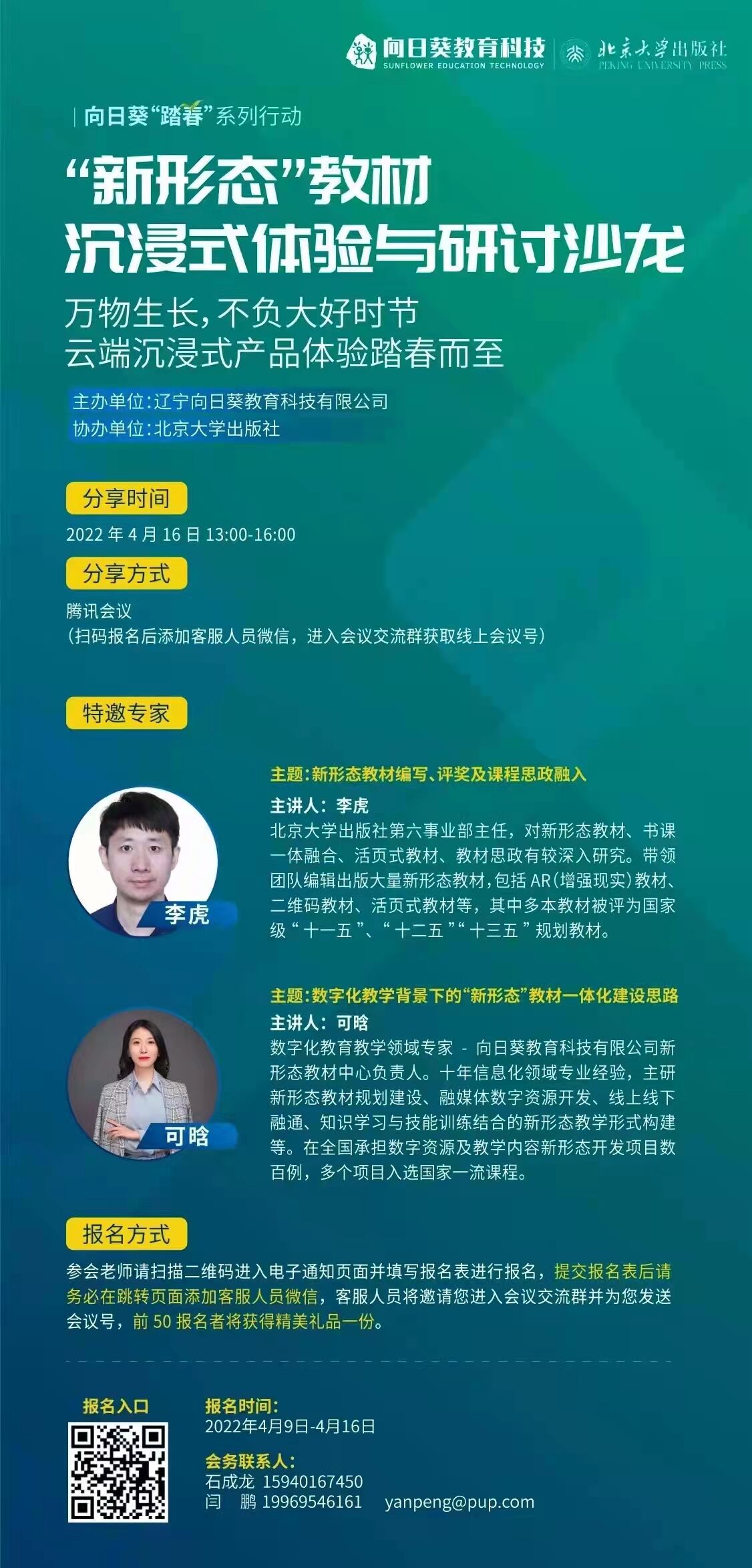 本周六下午13:00-16:00召开“新形态教材沉浸式体验与研讨沙龙”,会议议程详见海报,请感兴趣的教师扫描下方二维码参加。