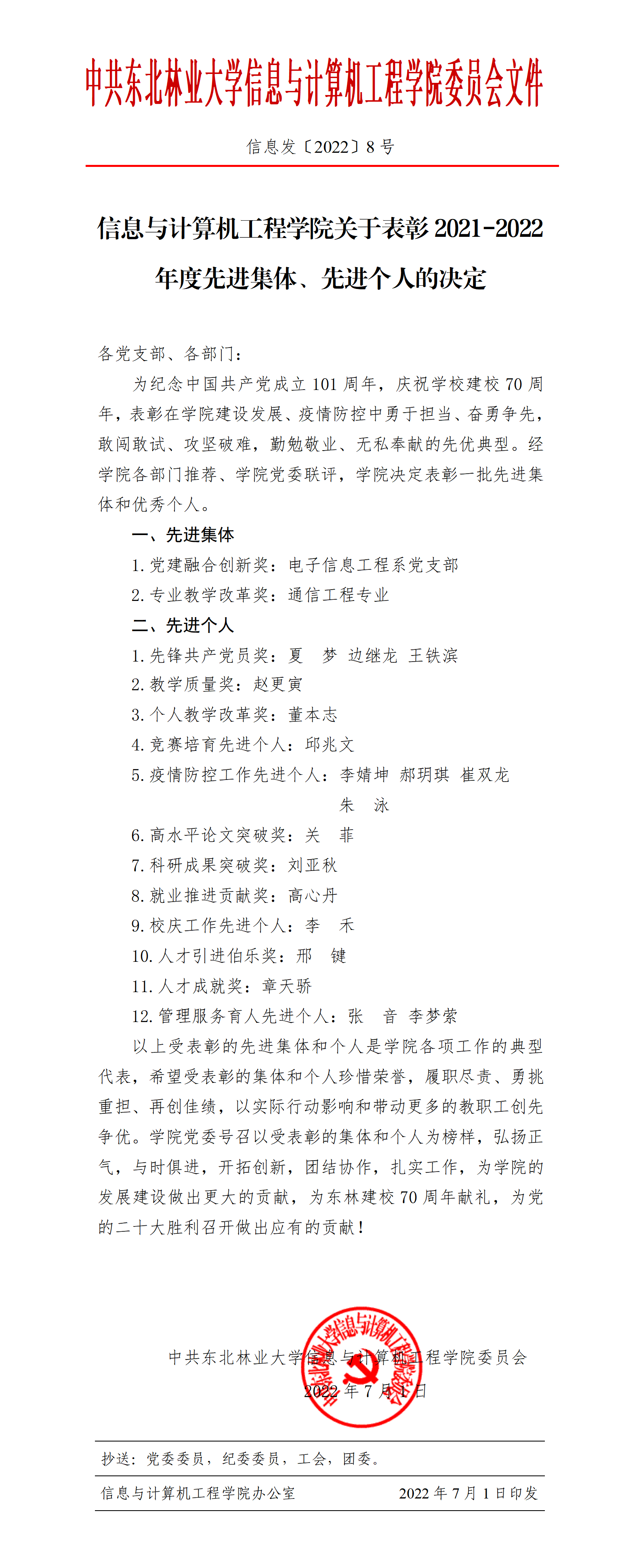 信息与计算机工程学院关于表彰2021-2022年度先进集体、先进个人的决定