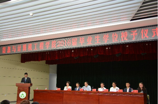 6月13日上午8时30分,信息学院2016届本科毕业生学位授予仪式在学校大学生活动中心隆重举行。李顺龙副校长、学院党政领导、各专业主任、毕业生家长代表和2016届全体毕业生参加了学位授予仪式。学位授予仪式由2016届毕业生辅导员杨尚霖主持。