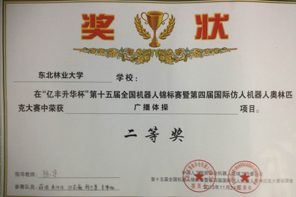 我校信息学院大学生创新实验室机器人竞赛团队共选派4支队伍参加了全国机器人锦标赛双人舞蹈、单人舞蹈、广播体操和短跑4个项目的比赛赛。经过3天的激烈比赛,由陈宇教师指导的队伍荣获了全国机器人锦标赛广播体操项目二等奖,由郭继峰教师指导的队伍荣获了全国机器人锦标赛单人舞项目二等奖,由仉俊峰教师指导的队伍荣获了全国机器人锦标赛双人舞项目三等奖。