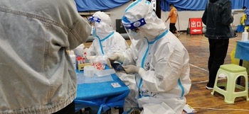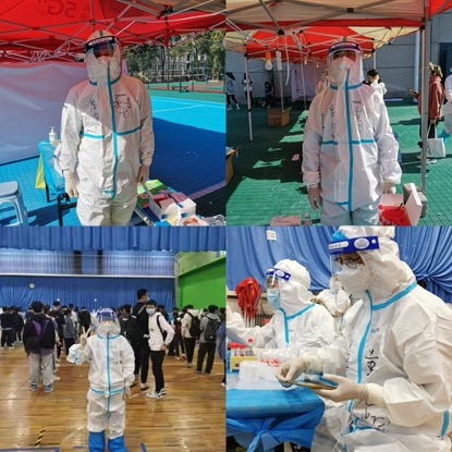 经过岗前培训后,四位志愿者穿好防护服,提前到达核酸检测场地,承担核酸检测现场扫码录入工作。自第三轮核酸检测后,核酸检测流程中增加了身份证现场验证的环节,检测速度有所减慢。志愿者的加入,使学校核酸检测工作速度明显加快,也方便了医护人员直接操作进行样本采集。密不透风的连身防护服、护目镜、口罩……“全副武装”的志愿者和医护人员们只为迎来疫情结束的那一天。