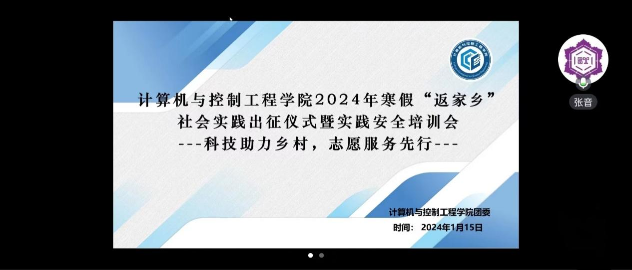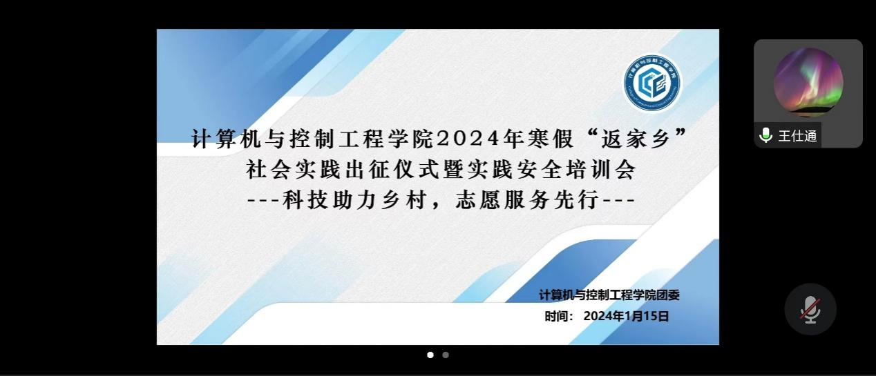 2024年1月15日19点,必威betway西汉姆联“科技助力乡村,志愿服务先行”2024年寒假“返家乡”社会实践出征仪式暨实践安全培训会在线上隆重召开,学院团委书记张音和团委副书记王仕通出席,近百余名实践团队师生代表参加本次出征仪式,会议由团委实践部部长李思贤主持。