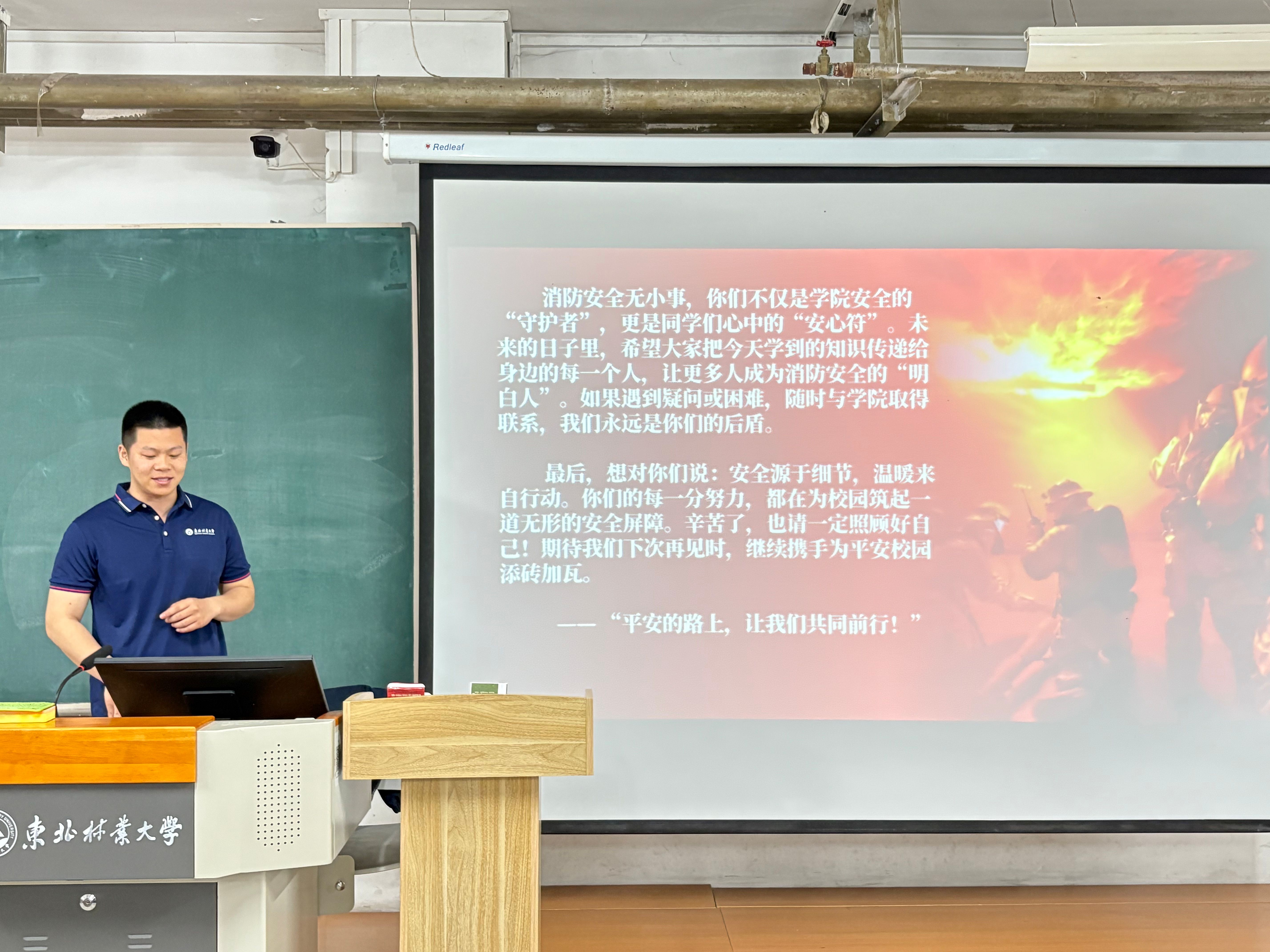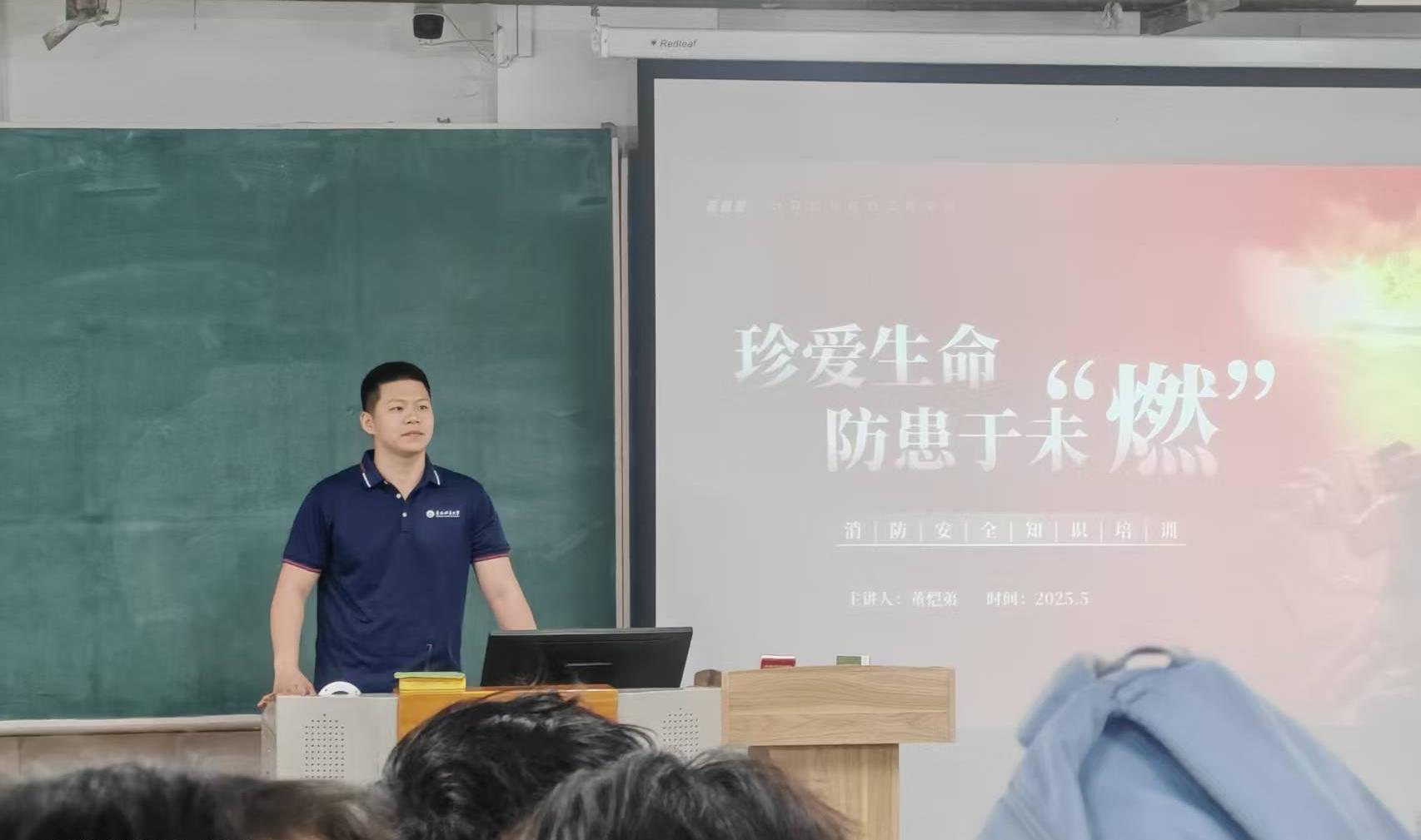 会上,董恺弟以近些年发生的典型火灾案例为切入点,深入剖析校园火灾的严重危害。他针对寝室等火灾易发区域,列举了使用违规电器、堵塞安全通道、缺乏基本消防知识等宿舍安全隐患,细致讲解了有效防范策略和火场逃生自救的技巧,并强调了防患于未然的重要性。