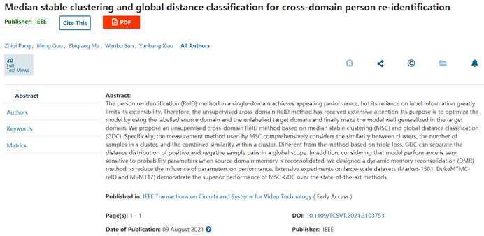 近日,必威西汉姆联信息与计算机工程学院郭继峰老师团队在中科院一区Top(升级版)期刊IEEE Transactions on Circuits and Systems for Video Technology(JCR Q1,CCF-B,IF=4.685)上在线发表了题为“Median stable clustering and global distance classification for cross-domain person re-identification”的研究论文。