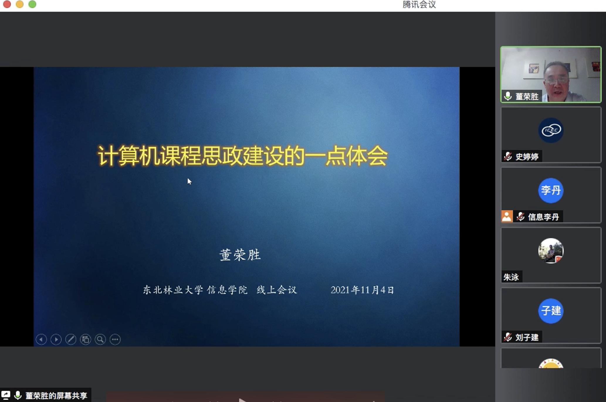 为全面贯彻党的教育方针,落实《高等学校课程思政建设指导纲要》要求,推进课程思政建设,将课程思政教育与专业教育课程相结合,11月4日下午13:30信息学院通过腾讯会议举办了第二期“课程思政专家谈”系列线上讲座交流活动。本次活动邀请桂林电子科技大学的董荣胜教授做了题为《计算机类课程思政建设的一点体会》的主题报告。