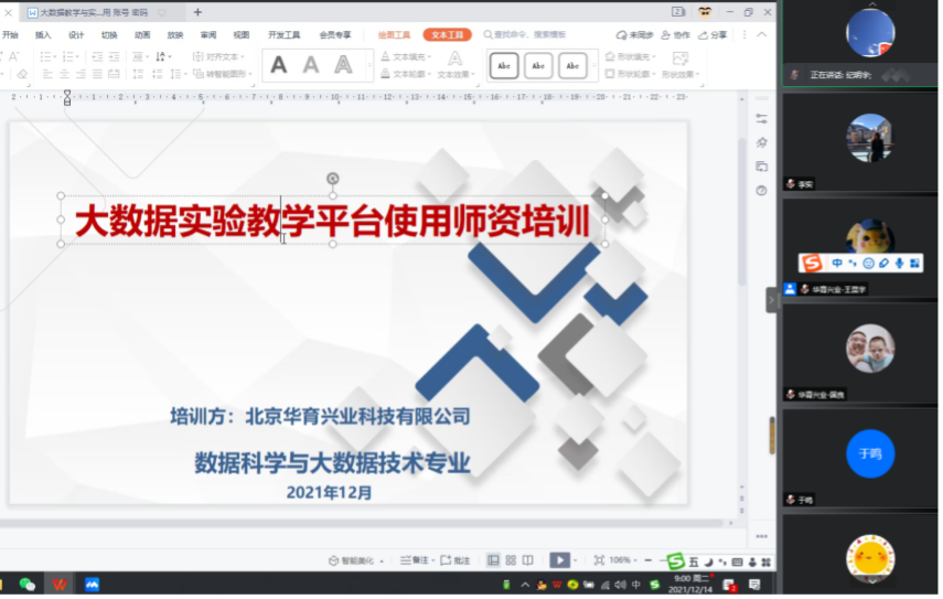 为推动专业课程建设,加强对现有教学实验平台的理解,提高教师的教学能力,12月14日上午,数据科学与大数据技术专业组织召开了大数据教学与实验平台师资培训会。培训会由专业主任纪明宇老师主持,大数据专业全体12名老师在线参加了此次培训。