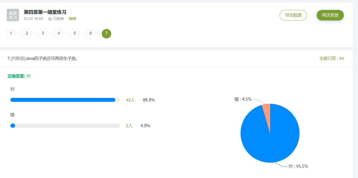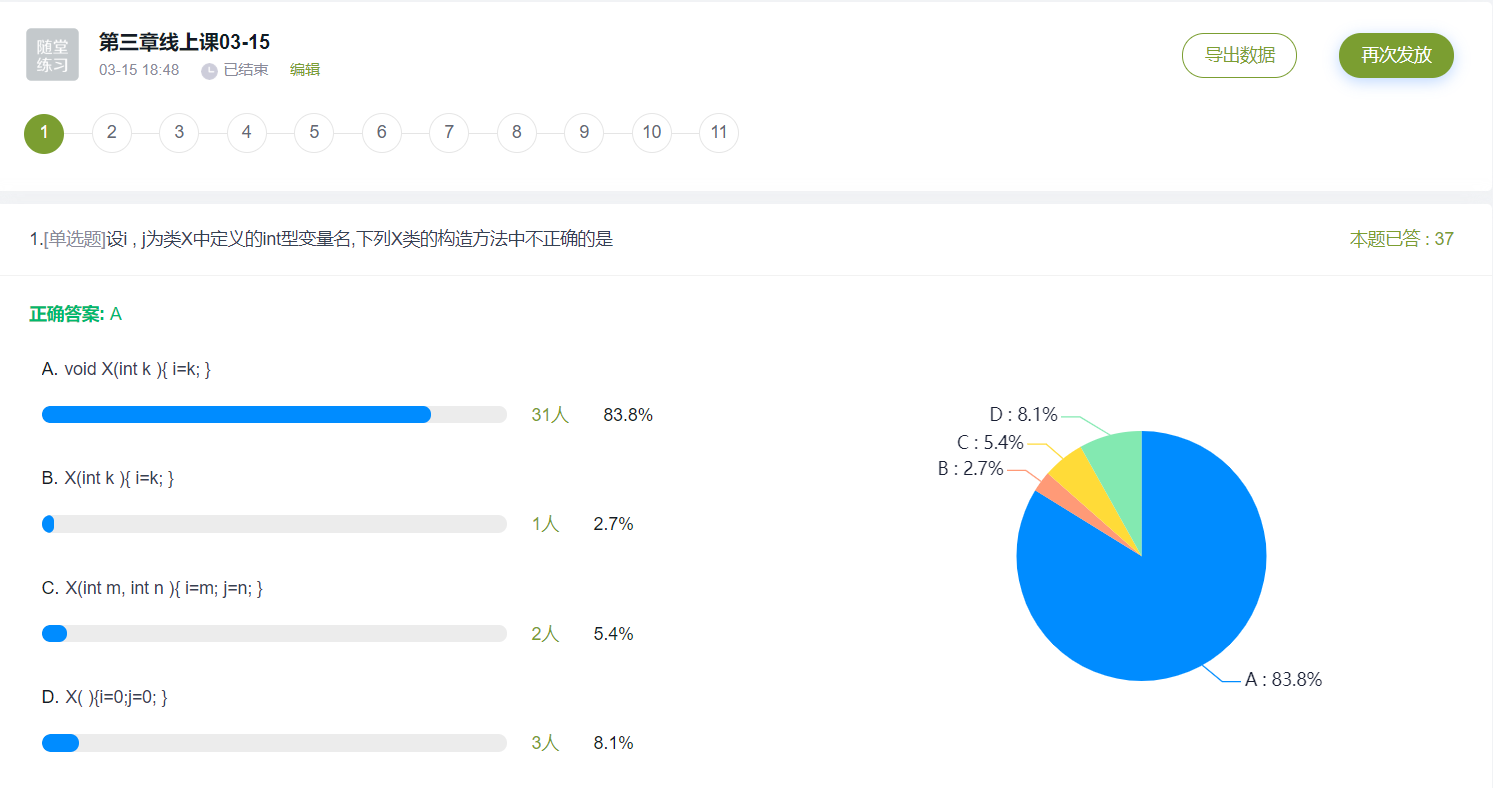 Java程序设计课程是Java系列课程的先修课,课程主要培养学生面向对象的编程思想和编程实践的能力。受疫情影响,本门课程从第3周开始改为线上授课方式。在线上授课过程中能运用信息技术透析整体线上教学过程,分析数据诊断学情,做到教学心中有“数”,同时在教学过程中依据学情及时优化教学方案,控制好线上教学课堂容量;追踪个案,分析差异,激发学习动力,落实个性分层教学;加强单元测试与作业等考核环节的设计,做到及时有效的作业反馈。确保疫情期间教学活动有质量的开展。