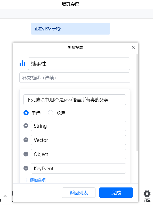 (2)分解课堂知识点,注重学生获得感。利用腾讯会议进行授课直播,直播时要注意知识点讲解过程中的目标明确,思路清晰。在课堂上利用腾讯投票功能进行知识点答题交互,利用直播间留言功能进行课堂问题交互;也可以与学生语音直接交流。课后导出会议参会情况,分析学生听课情况。