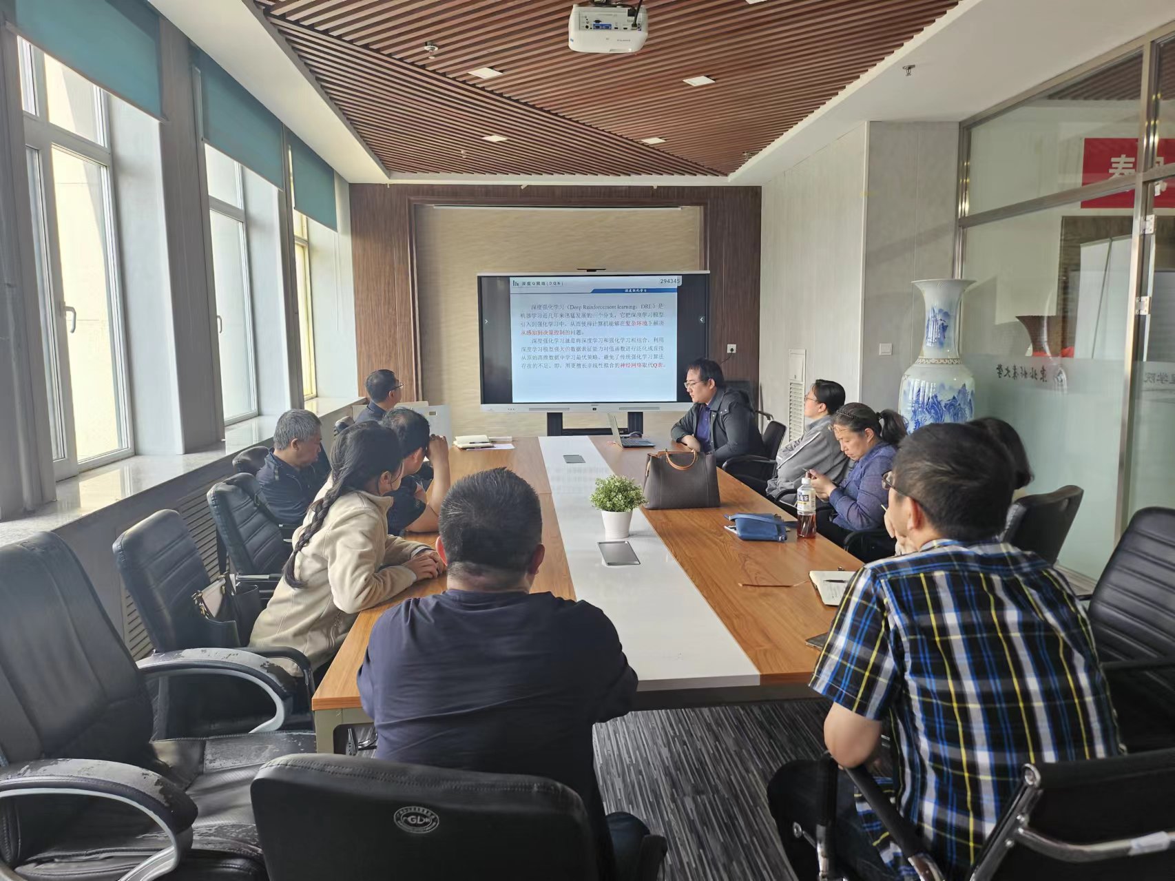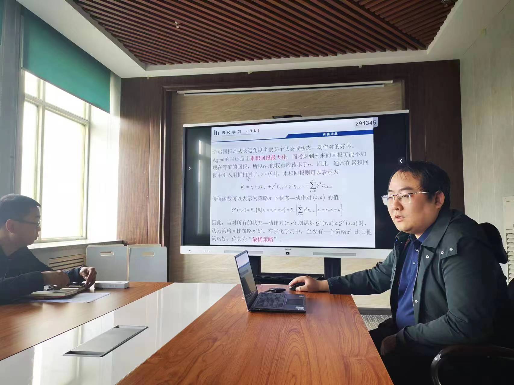 随后,李真老师继续向参会人员介绍了深度强化学习研究领域的前沿动态和现有成果。结合本次研讨会的主题,参会人员就通信领域中深度学习方法的未来发展方向展开了深入热烈的探讨,通信工程专业王健主任特别强调了传统通信方法与前沿深度学习方法结合的重要性和必要性,鼓励各位老师努力提高自己的科研水平,为专业学科发展做出更大的贡献。