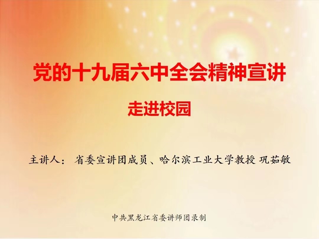 本次宣讲会由省委宣讲团成员、哈尔滨工业大学教授巩茹敏为大家进行宣讲,会议对全会精神特别是习近平总书记的重要讲话精神作了深入阐释,本次宣传会主要分为四个部分,一是十九届六中全会的总体概况,二是十九届六中全会涵盖的主要内容,三是十九届六中全会彰显的鲜明的亮点,四是十九届六中全会带来的思考与启示。