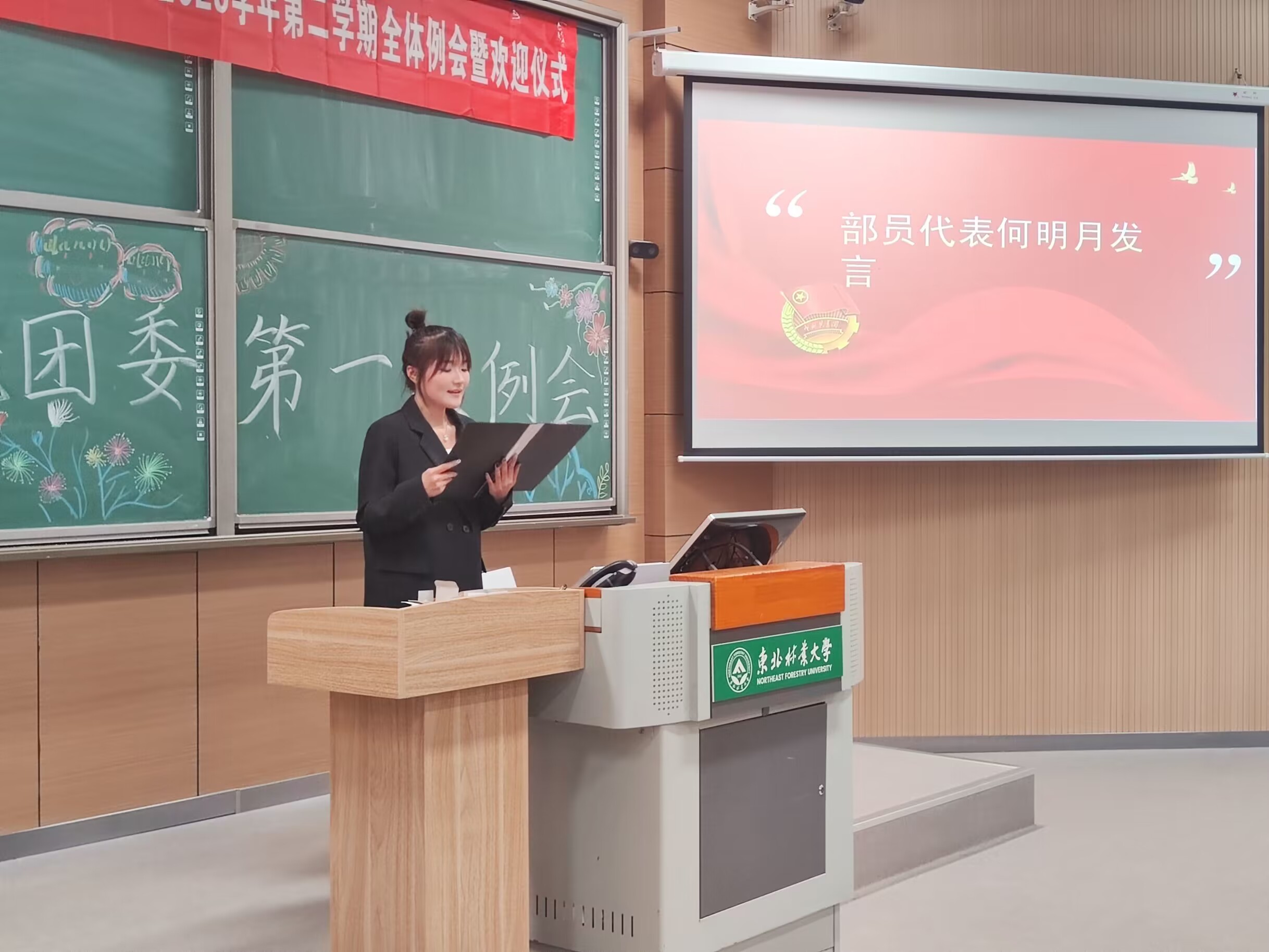 接下来的部长发言中,各部长都表示将在未来的工作中将落实好各项任务,积极配合协调其他部门工作、提升个人能力、倾听领导老师要求,分工合作,携手共进。随后是团副发言,王仕通、周树森两位副书记均表示自己将做好榜样,努力将计控团委建成有组织有纪律,活泼紧张又严肃认真的院组织。孙慧杰副书记也通过视频传达了对各部长以及部员的殷切希望以及作为团委副书记的自我要求。在部员代表讲话环节,何明月同学在发言中提到,自己在团委大家庭中学习进步颇多,在以后的工作中将更加认真负责,不忘初心。