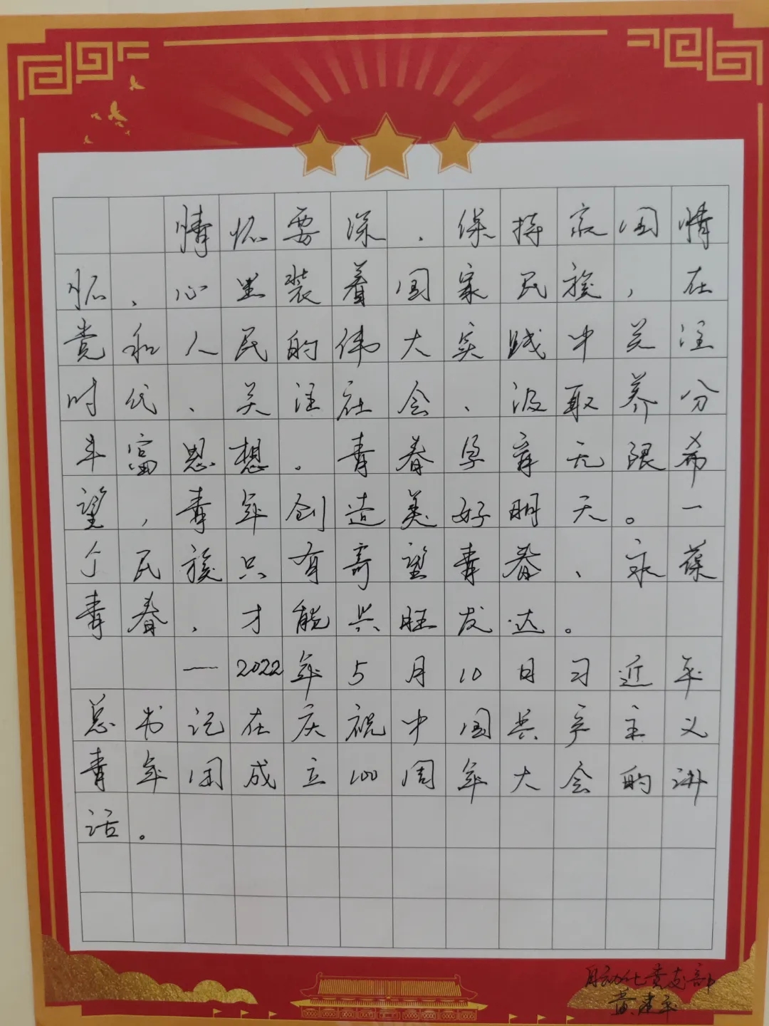 在比赛过程中,选手们个个坐姿端正、握笔规范、神情专注、用心书写,用自己的作品展示了书法的魅力和独特风格,在书写过程中中,选手们凝神聚气,心身合一,用心领会习近平总书记系列讲话精神内涵,一词一句描绘青春万卷,一笔一捺书写方正人生,规整的汉字形态不仅昭示着中国人的文化自信,也承载着中国人的精神内核。