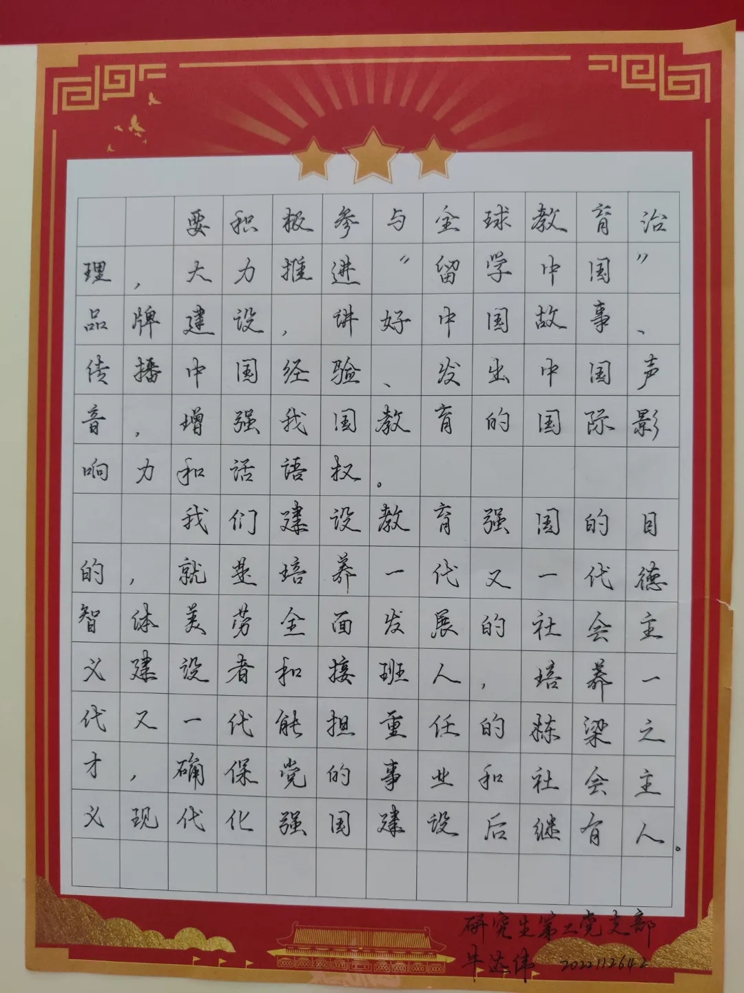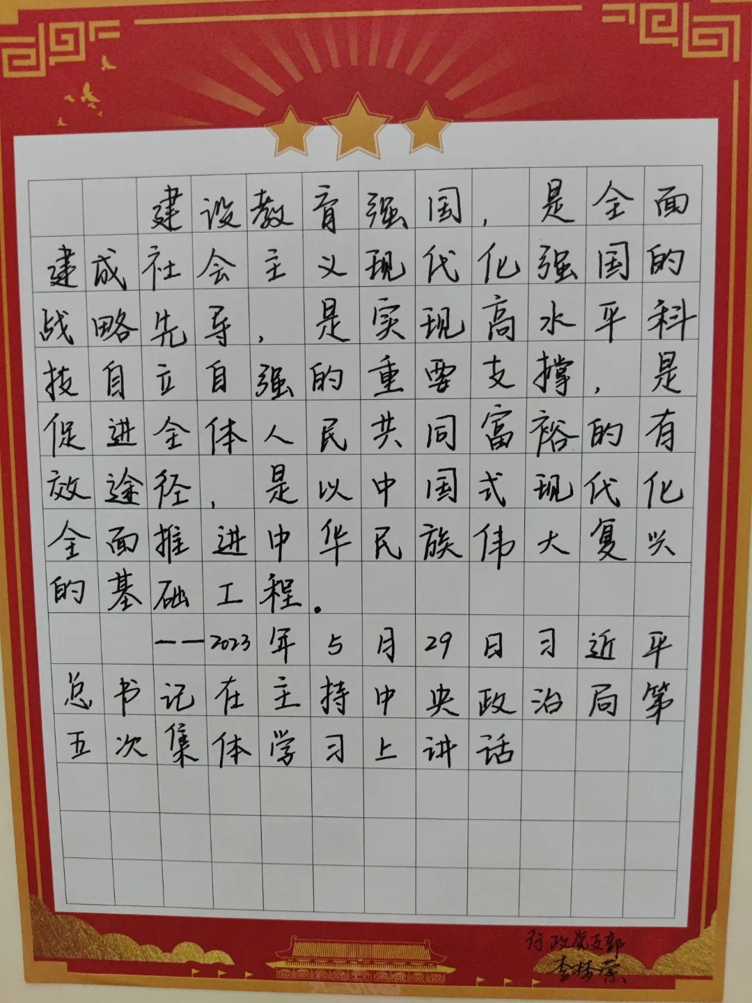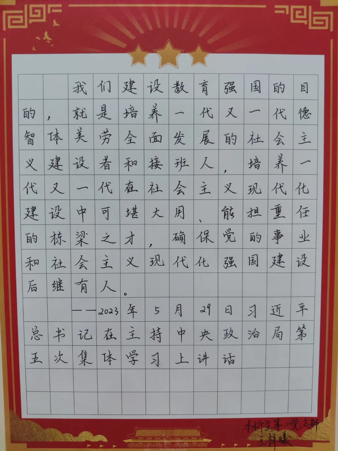 为进一步推动学习贯彻习近平新时代中国特色社会主义思想主题教育走深走实,传承和发扬中国书法文化,在凝神聚气中感悟奋进力量,2023年6月18日晚,由必威betway西汉姆联党委主办,本科生第二党支部承办的“习语润心 • 人才强国”硬笔书法大赛在锦绣楼T201成功举办,学院各党支部均参与到本次活动中来。