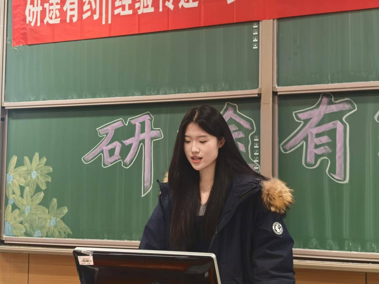 刘梦博从学业情况、课余活动和自身感受三个方面进行了经验分享。他以专业课的学习为出发,为同学们日后的学习规划提出了自己的一些建议。而后结合自身经历对在大学期间是否担任学生干部以及担任学生干部的进行了具体分析。在此期间他还倡导同学们积极投身社会实践,不断提升自身的综合素质。在回顾大学生活的点滴后,他特别强调了调整心态的重要性,并与同学们交流了自己在这一过程中积累的一些心得体会。