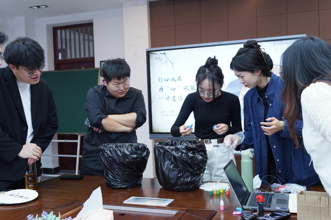 进入漆扇制作环节,辅导员老师们纷纷挑选自己心仪的扇子和搭配的大漆颜色,将扇子缓缓浸入颜料中,伴随着左右摇晃或轻微旋转,扇面呈现出多变的纹路,形成了独一无二的漆扇。尽管手法略显生疏,但大家都沉浸其中,深切体会到了非遗技艺传承的不易与乐趣。
