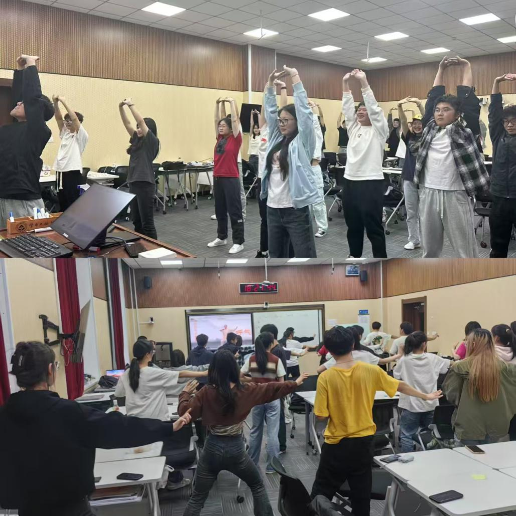 在热身活动阶段中,随着轻柔舒缓的音乐,大家开启了一段独特“八段锦静心之旅”。这套传承千年的养生功法,以行云流水般的动作配合悠长呼吸,同学们纷纷舒展筋骨、唤醒身体能量,放下杂念、回归当下。