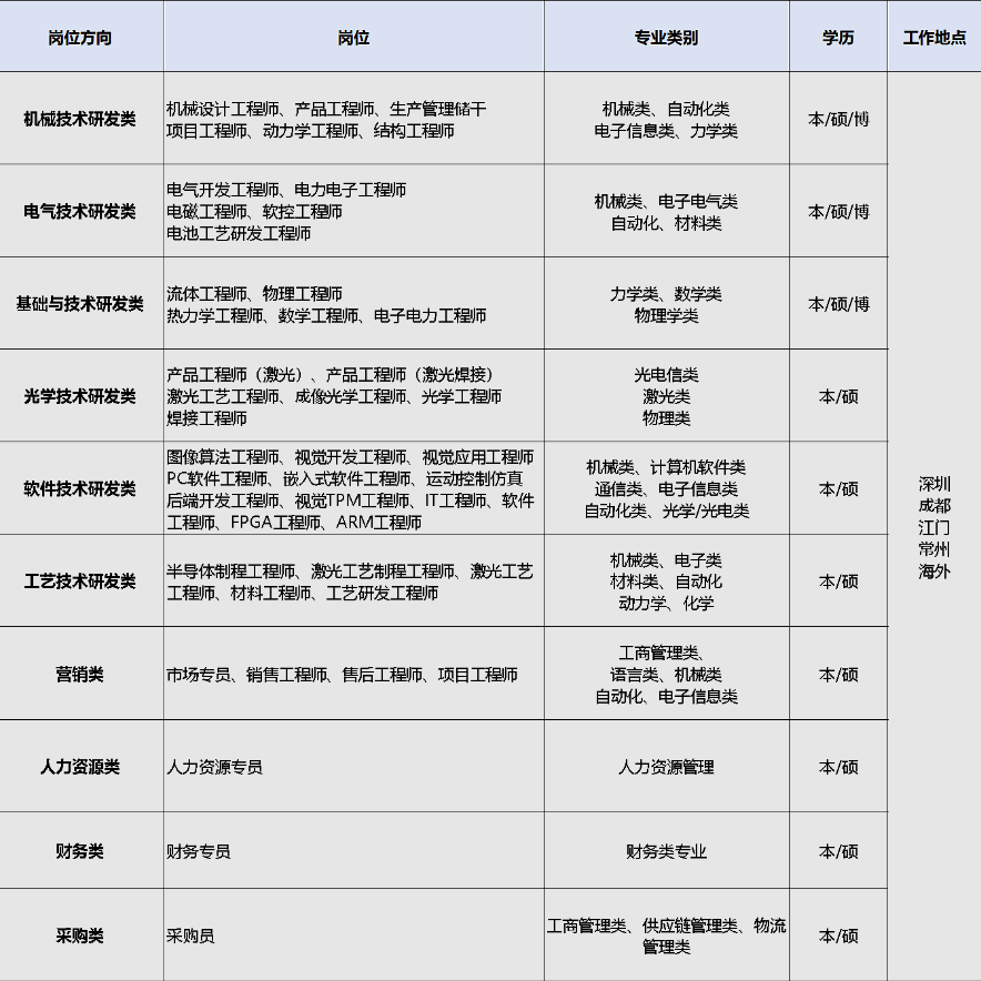 现已成为新能源上游核心部件产业链重要成员,在新能源赛道中迎来发展大爆发,规模成倍扩张,连续两年实现业绩与规模的100-150%飞跃式增长,成为新能源智能装备行业的龙头企业。公司立足中国市场、积极开拓海外市场,扎根布局深圳、成都、常州、江门,已建设自有研究院、四个大型现代化生产基地;未来大力拓展欧洲、北美等跨国蓝海市场,大量引进研发、销售、项目管理类等国际化人才,致力于成为智能制造综合解决方案的全球龙头企业。
