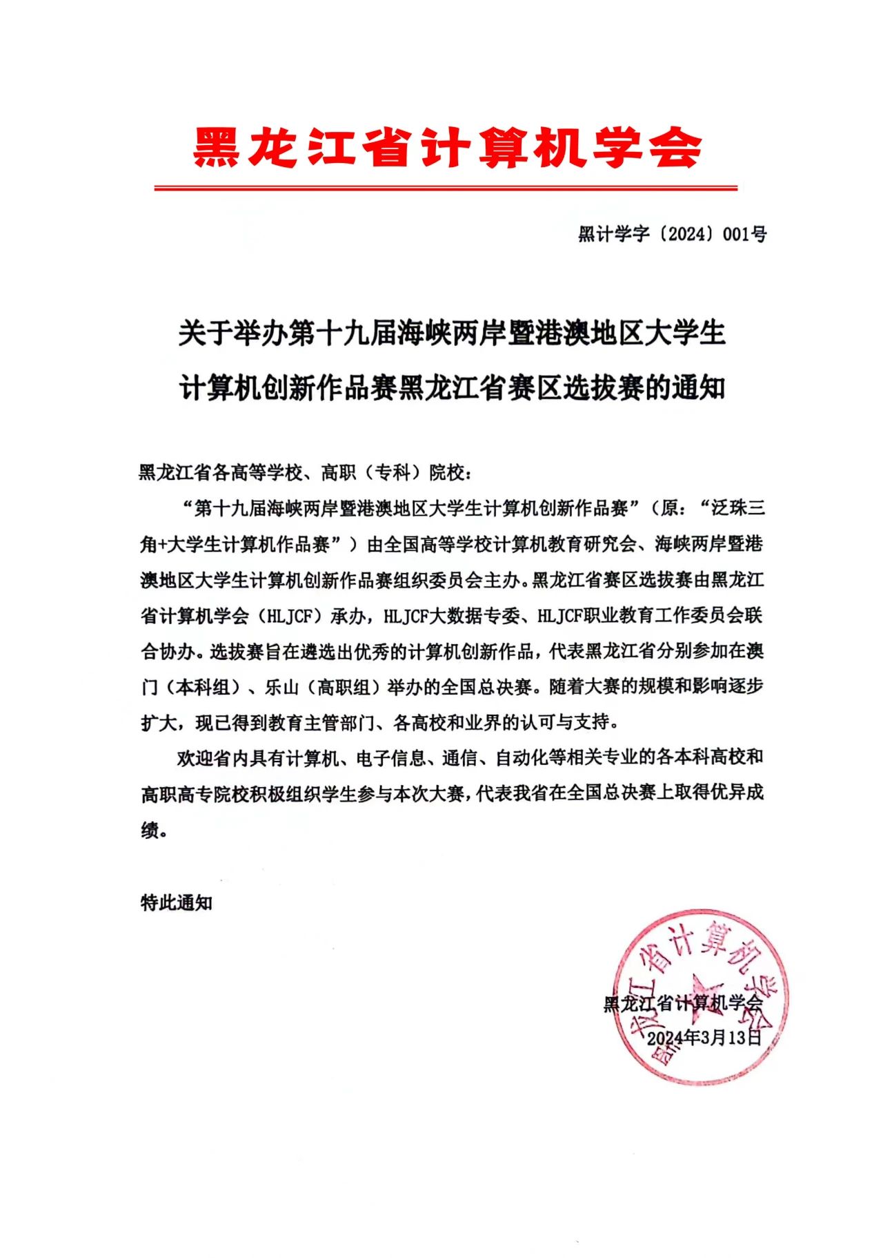 计算机创新作品赛黑龙江省赛区选拔赛的通知