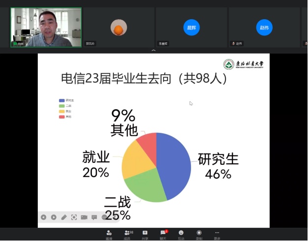 会议首先由白岩老师进行了2023届毕业生的考研和就业情况介绍,2023届学生98人,读研人数占比46%,就业人数占比20%,综合就业率为66%。其中读研学生进入了电子科技大学、西北工业大学、北京航空航天大学等学校就读。就业同学的工作地点集中在长三角、珠三角一带,普遍薪资在月薪一万元以上。介绍考研和就业信息之后,白老师也对同学们提出了自己的建议,希望同学们找准方向,持之以恒,为考研或就业做好准备。